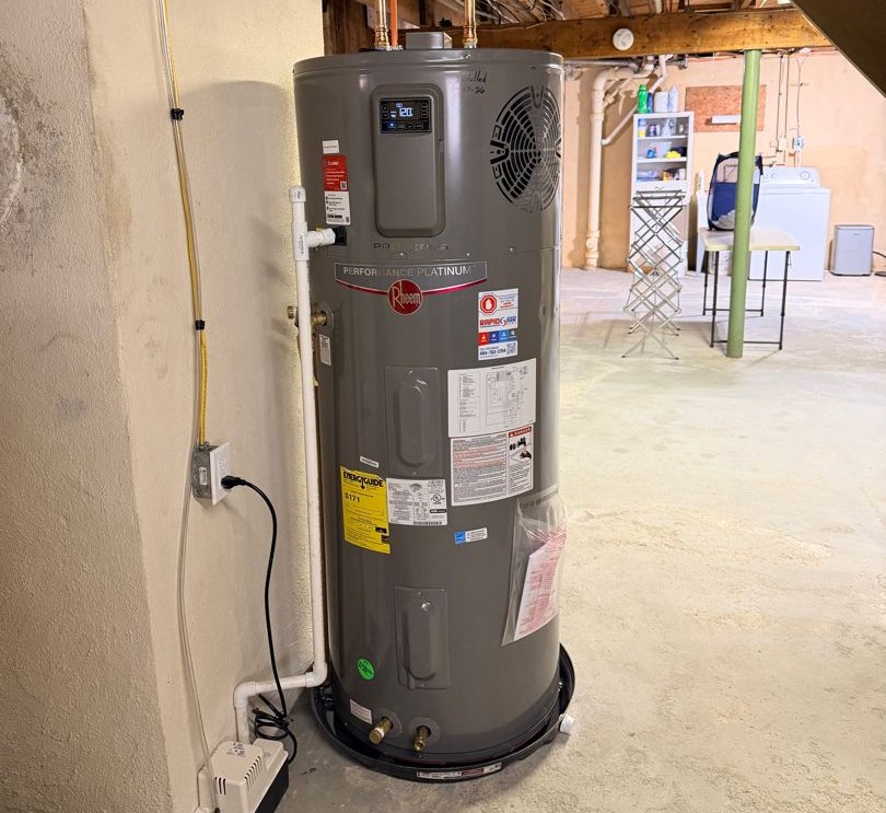 We installed a new 65-gallon Rheem heat pump water heater. Unlike traditional water heaters that generate heat directly, heat pump water heaters pull heat from the surrounding air and transfer it into the water tank, using significantly less energy in the process. For a full look at what we offer, visit our hot water heater services page.